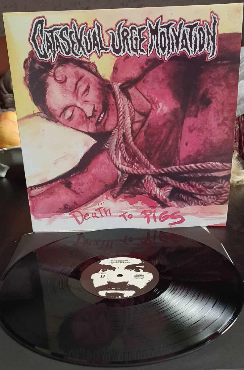 CATASEXUAL URGE MOTIVATION is a Death/Gore/Grind/Industrial band from Tokyo ”Death To Pigs” absolutely savage rare recording from this infamous Japanese ensemble. 21 tracks in 41 minutes ultra fast typhoon blastcore gore & social hatred for fans of serial killer pathology & musical murder. All the artwork composement is based on the Manson Family’s murders. Now finally available on vinyl again. The black LP version is limited to 200 copies and comes extra with photo insert.